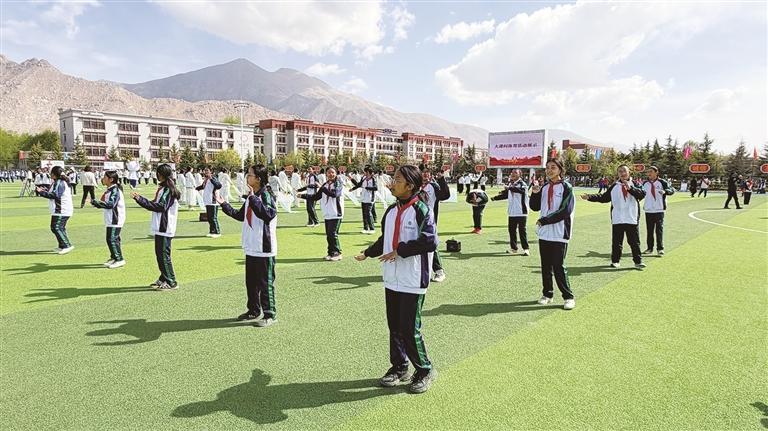 值得關注的是,部分學校的學生現(xiàn)場展示了民族操與武術,吸引了在場師生的目光。拉薩北京實驗中學初二學生卓嘎說,如今學校課間已延長至15分鐘,大家有充足的時間放松休息。她平時很喜歡打羽毛球,偶爾也會參加網球課程,每天的體育鍛煉時間能達到2小時以上。