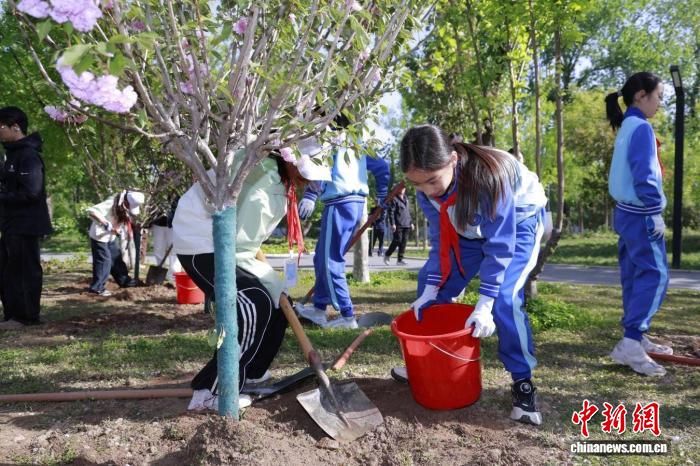 圖為活動現(xiàn)場,來自北京和西藏的青少年共同參與植樹活動。(中國宋慶齡青少年科技文化交流中心 供圖)