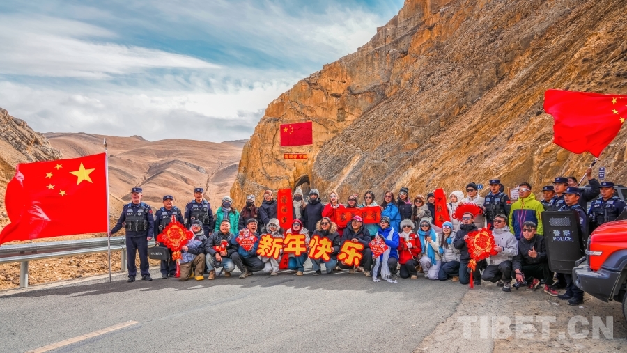 圖為2月9日,扎西宗邊境派出所民警與游客們合影,共度新春