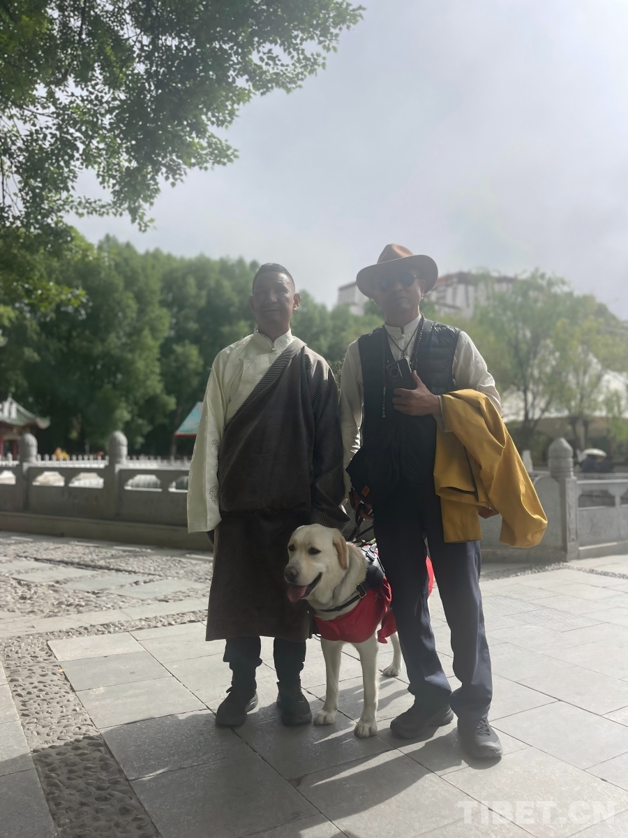 2024年5月,達瓊(左)和王永東,與導盲犬福桔在拉薩合影