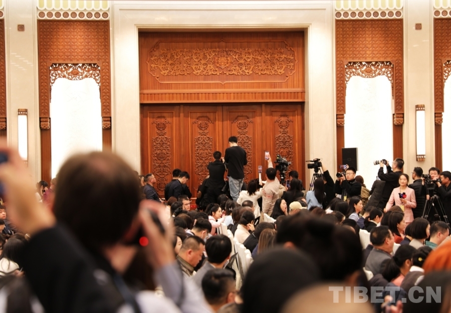 3月3日下午,全國政協(xié)十四屆四次會(huì)議新聞發(fā)布會(huì)開始前,記者們對準(zhǔn)大會(huì)新聞發(fā)言人劉結(jié)一即將進(jìn)入的新聞發(fā)布廳大門。攝影:劉莉