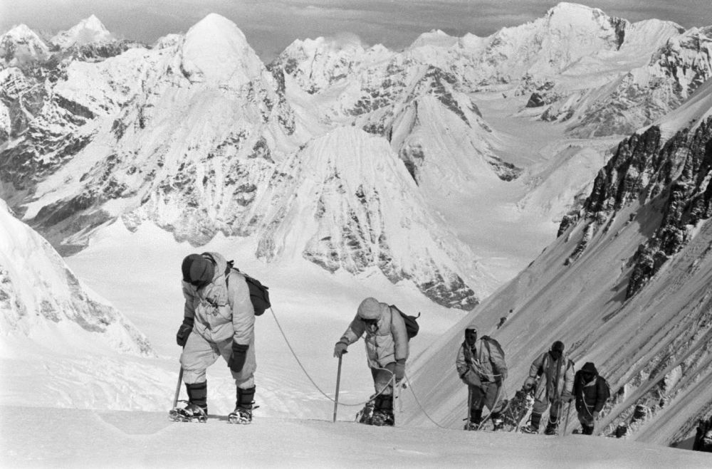 中國(guó)登山隊(duì)隊(duì)員在海拔7150米的冰雪坡上行進(jìn),照片拍攝于1960年5月。圖片來(lái)源:新華社