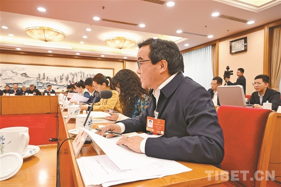兩會(huì)期間,西藏代表團(tuán)舉行全體會(huì)議,拉瓊在會(huì)上發(fā)言。來源:西藏日報(bào)