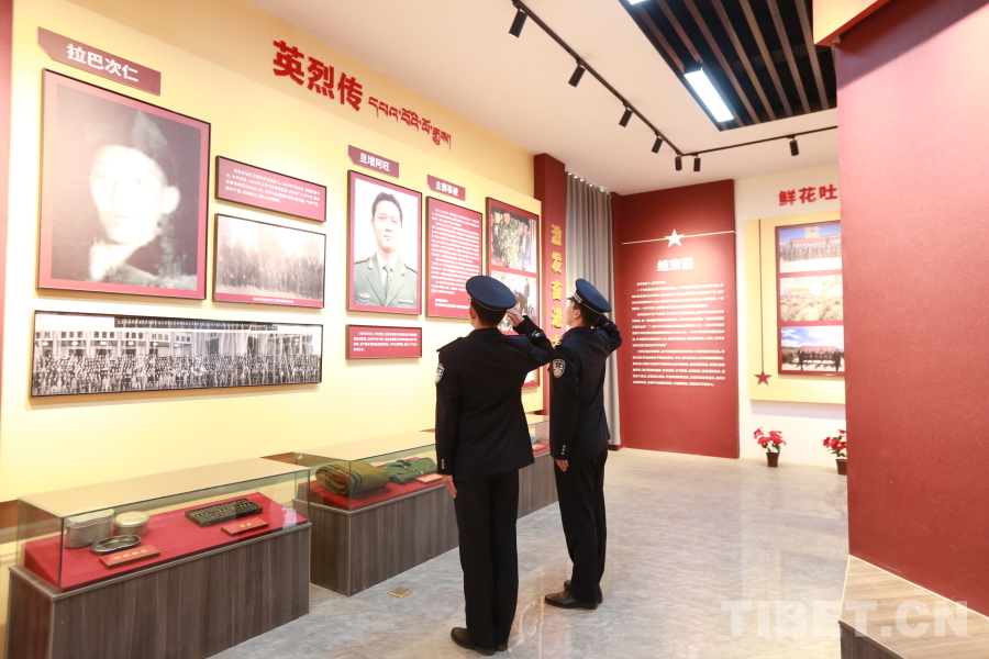 吉隆出入境邊防檢查站民警在吉隆縣烈士陵園烈士紀(jì)念館向旦增阿旺烈士敬禮
