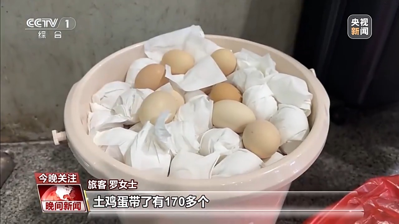 旅客 羅女士:土雞蛋帶了有170多個(gè),給兒媳婦還有女兒,她們每一個(gè)拿點(diǎn),她們都在成都上班。老家?guī)н^(guò)來(lái)的土雞蛋,味道不一樣,吃起來(lái)香嘛。