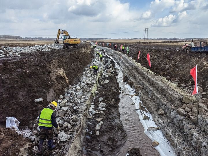 3月20日,在吉林省榆樹市黑林鎮(zhèn)豆坊村高標(biāo)準(zhǔn)農(nóng)田建設(shè)現(xiàn)場,工人們在修繕排水溝渠。