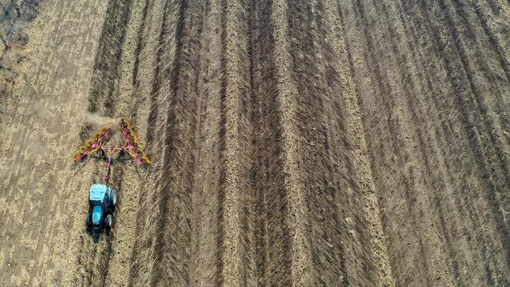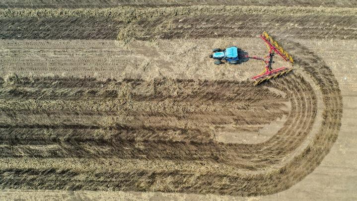 4月2日,在吉林省公主嶺市范家屯鎮(zhèn)乾程農(nóng)民專業(yè)合作社,農(nóng)民駕駛農(nóng)機整理耕地上的秸稈(無人機拍攝)。