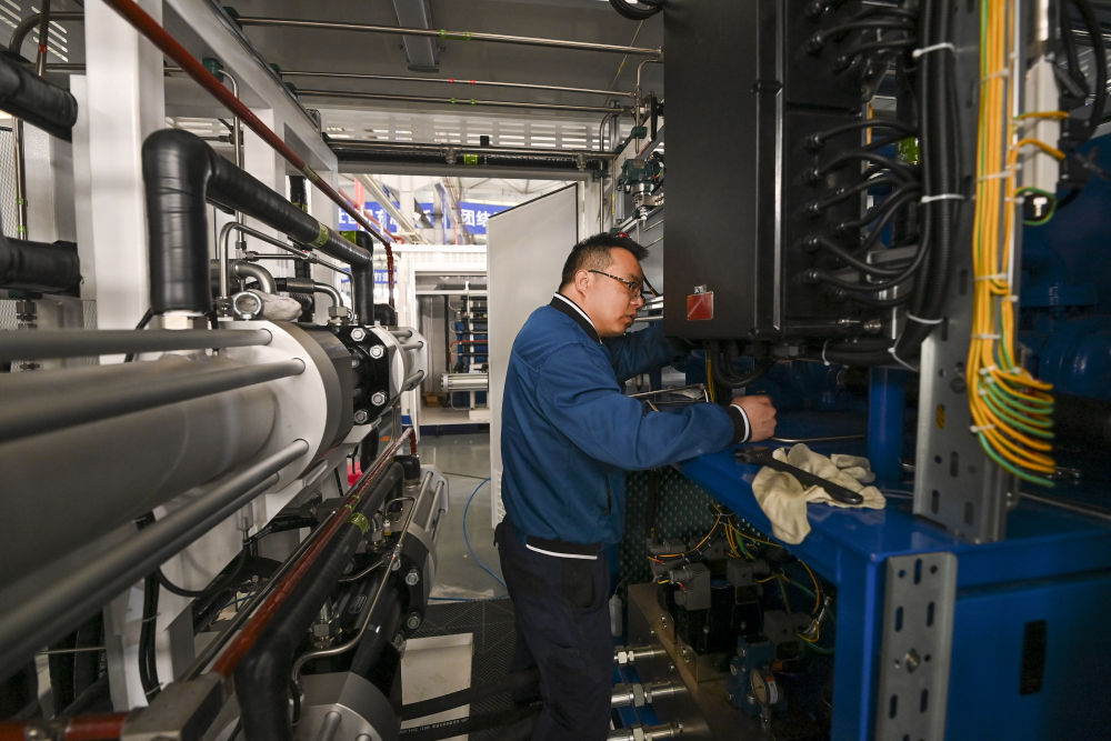 在位于山西省長(zhǎng)治市高新技術(shù)產(chǎn)業(yè)開發(fā)區(qū)科技工業(yè)園的一家公司內(nèi),工作人員在調(diào)試氫能設(shè)備(4月2日攝)。新華社記者 楊晨光 攝