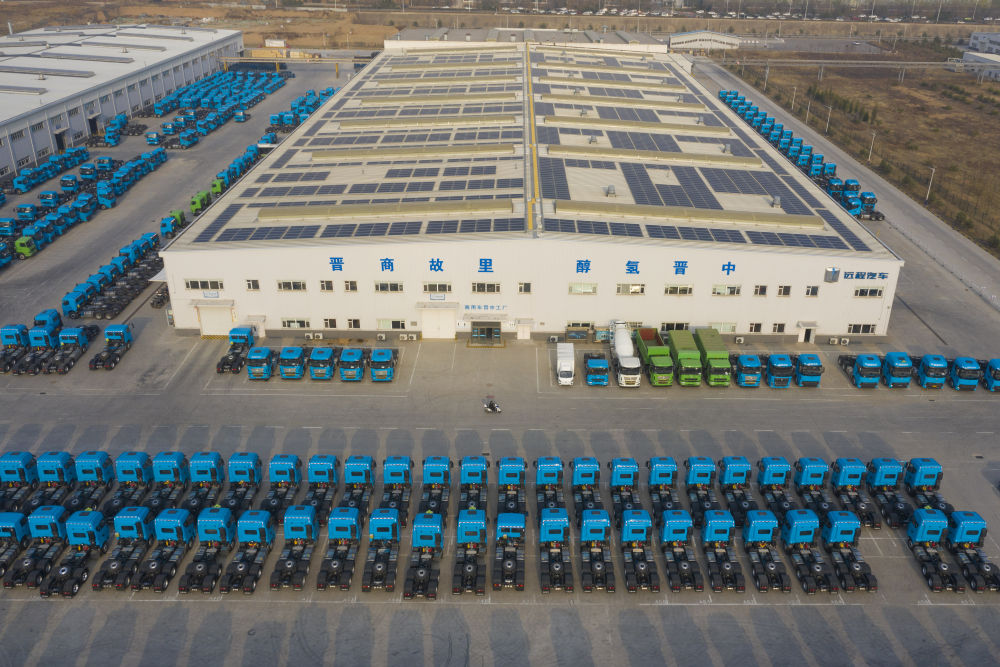 這是在位于山西省晉中市榆次區(qū)的山西新能源汽車工業(yè)有限公司(吉利晉中基地)拍攝的甲醇重卡(4月1日攝,無人機(jī)照片)。新華社記者 楊晨光 攝