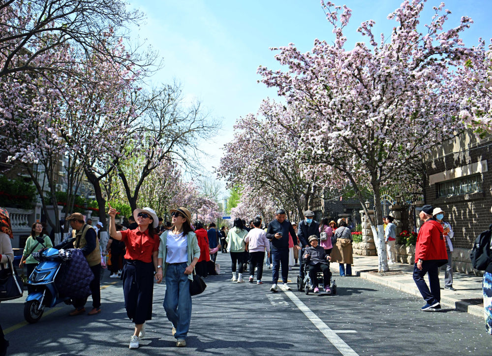游客在海棠花盛開(kāi)的五大道大理道上漫步休閑(4月7日攝)。
