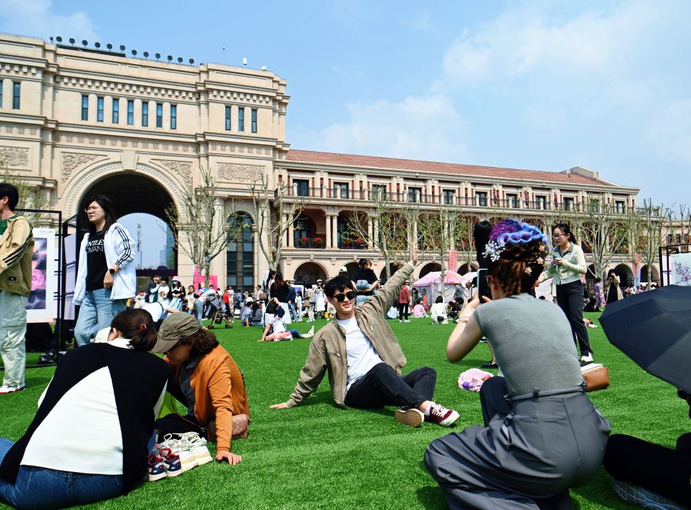 游客在五大道民園廣場(chǎng)休閑游玩(4月13日攝)。
