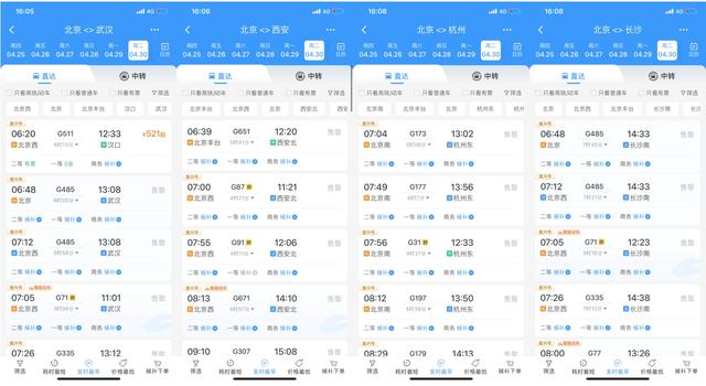 從節(jié)前預(yù)訂情況看,4月30日北京出發(fā),前往武漢、西安、杭州、長沙等方向車票極為緊俏。截至16日16時,上述方向車票大面積售罄,僅清晨6時許出發(fā)車次尚存余票。