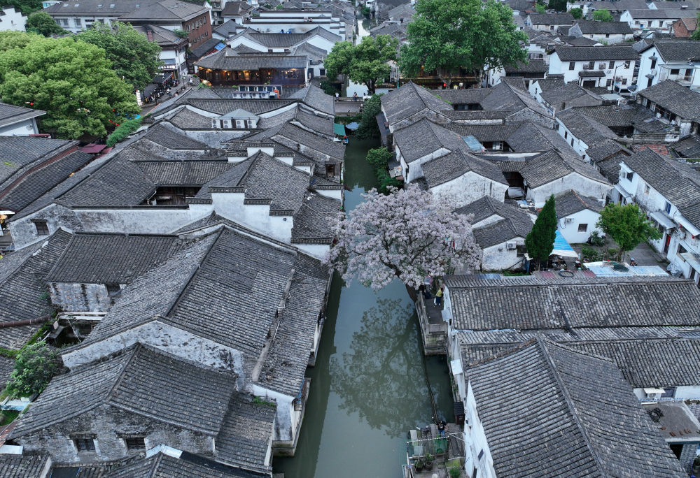 鳥瞰紹興倉(cāng)橋直街(4月24日攝,無(wú)人機(jī)照片)。新華社記者翁忻旸 攝