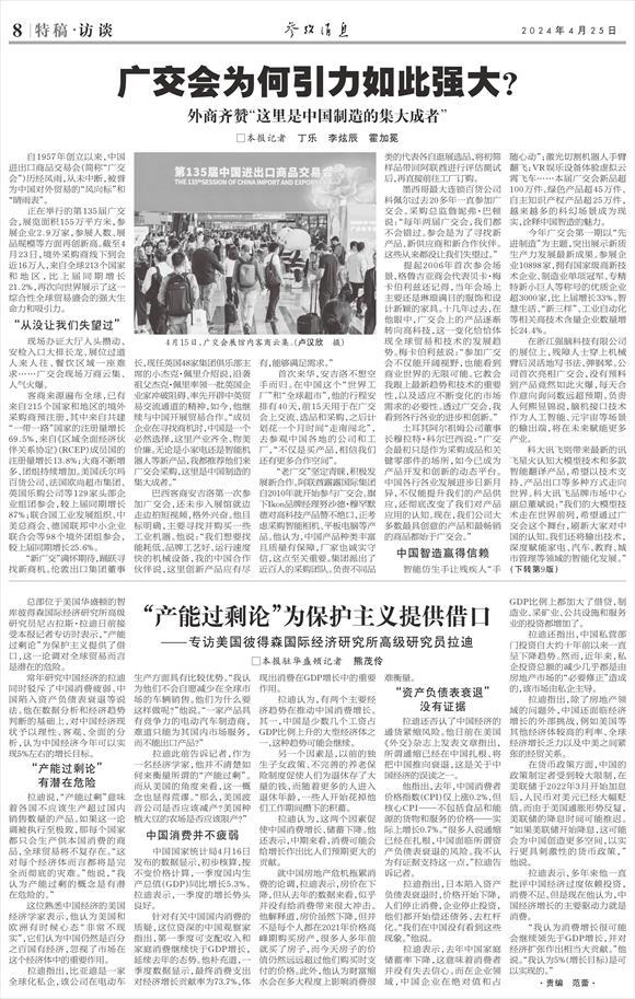 正在舉行的第135屆廣交會(huì),展覽面積155萬平方米,參展企業(yè)2.9萬家,參展人數(shù)、展品規(guī)模等方面再創(chuàng)新高。截至4月23日,境外采購(gòu)商線下到會(huì)近16萬人,來自全球213個(gè)國(guó)家和地區(qū),比上屆同期增長(zhǎng)21.2%,再次向世界展示了這一綜合性全球貿(mào)易盛會(huì)的強(qiáng)大生命力和吸引力。
