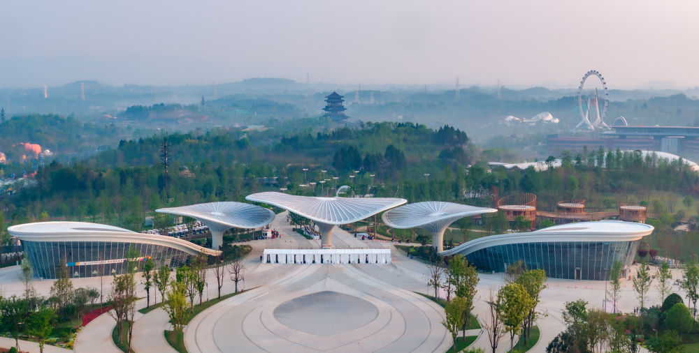 這是成都世園會主會場入口,鋼質建筑相連形成三朵高大的“芙蓉花”(2024年4月22日攝)。新華社記者 王曦 攝