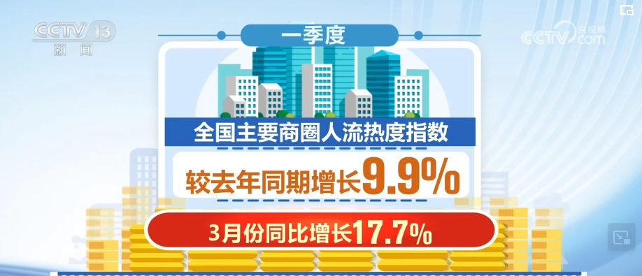 國家信息中心數(shù)據(jù)就顯示,一季度,全國主要商圈人流熱度指數(shù)較2023年同期增長9.9%,其中,3月份同比增長17.7%。