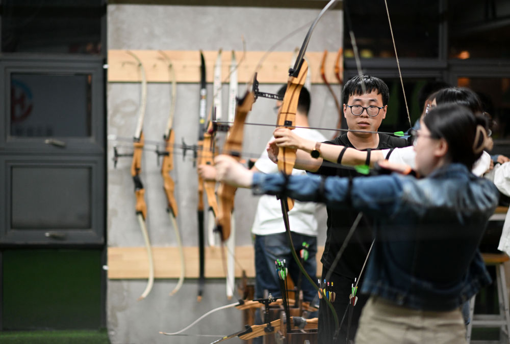 ↑4月25日,在天津市璽元銳鋒射箭俱樂部,學員在河西區(qū)青年夜校射箭課上體驗射箭運動。