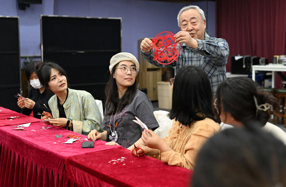 ↑4月24日,在天津市河西區(qū)春秋文化藝術(shù)中心,河西區(qū)青年夜校教師在剪紙體驗課上展示學員作品。