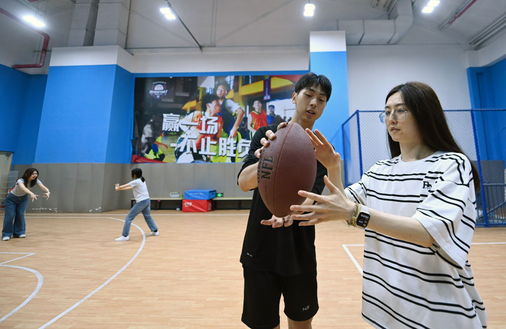 ↑4月25日,在天津市南開區(qū)瑞步青少年籃球俱樂部,南開區(qū)青年夜校教師指導學員練習腰旗橄欖球。