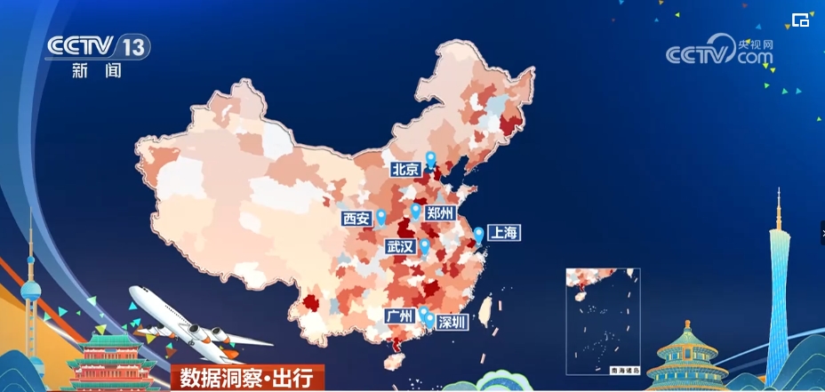這是一張根據(jù)12306火車票預(yù)售數(shù)據(jù)繪制的熱力圖,紅色越深代表在5月1日乘火車凈流入到這個城市的人越多,藍色越深則表示凈流出這里的人越多??梢钥吹?,北上廣深、武漢、鄭州、西安等中心城市是凈流出人數(shù)較多的城市。