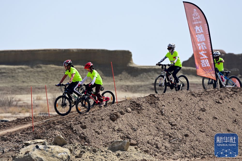 在新疆克拉瑪依市烏爾禾區(qū)世界魔鬼城景區(qū),小朋友們在自駕線路上體驗自行車越野(5月1日攝)。