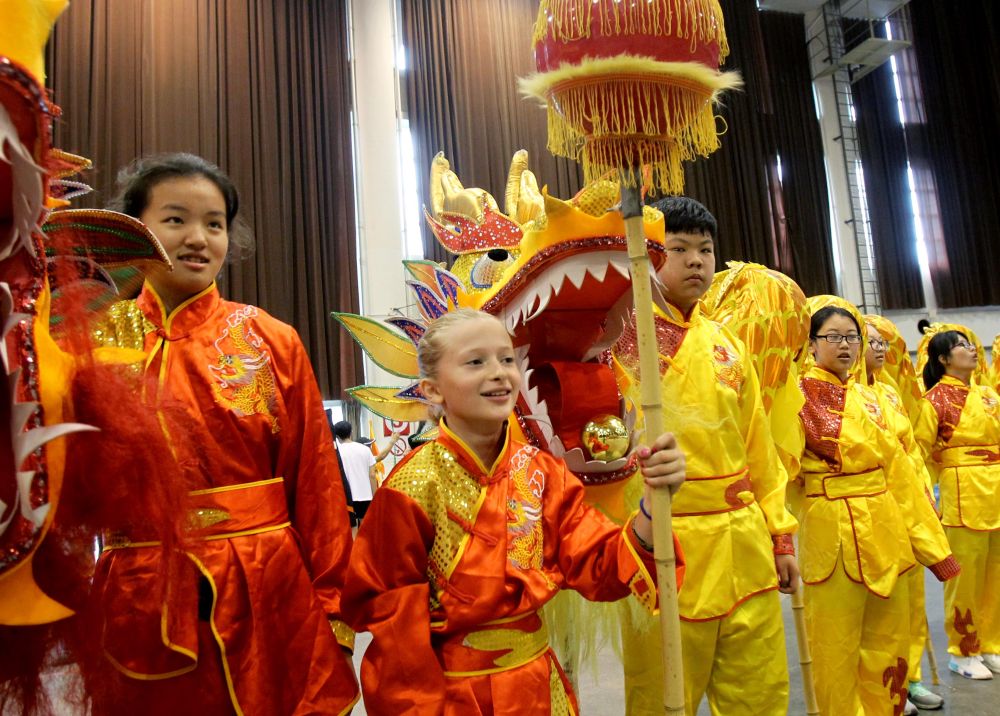 ↑2016年6月9日,上海向明初級中學(xué)的學(xué)生、法國女孩凱米(左二)在學(xué)校龍獅隊中擔(dān)任引獅人的表演任務(wù)。