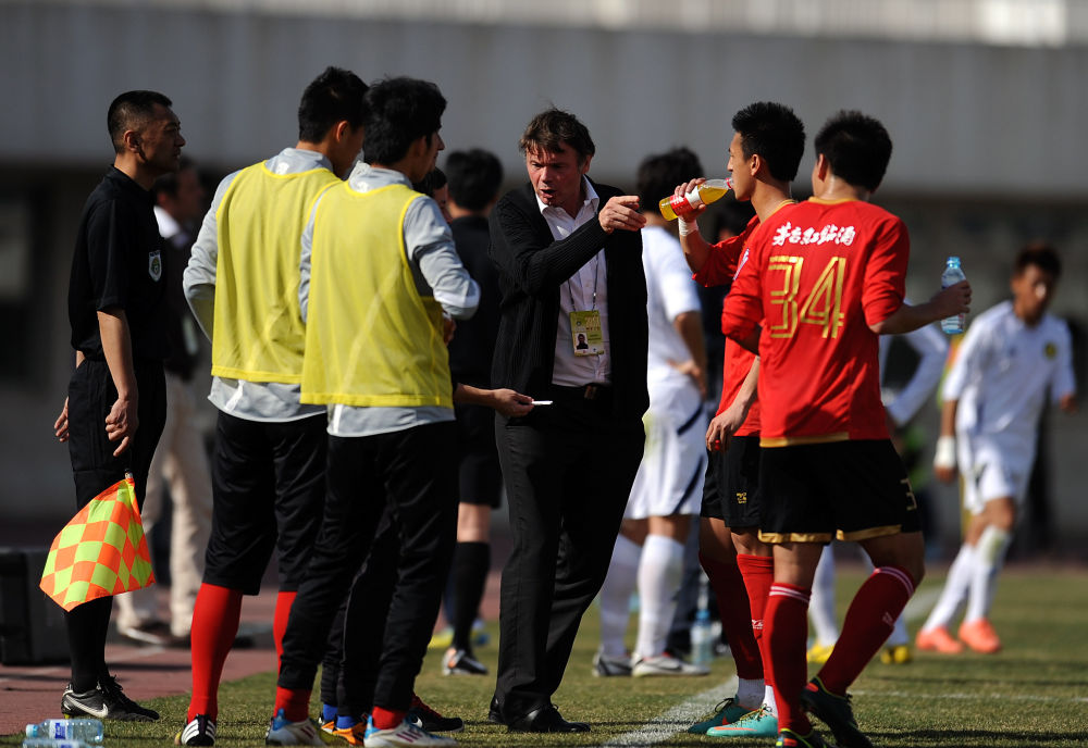 ↑2013年4月13日,時任深圳紅鉆隊法國主教練特魯西埃(中)在2013/2014賽季中國足球甲級聯(lián)賽第五輪中布置戰(zhàn)術(shù)。