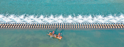 湖南省永州市東安縣白牙市鎮(zhèn)鐵爐村村干部(左)與志愿者在湘江一級(jí)支流紫水河上打撈漂浮物。 蔡小平攝(人民視覺)