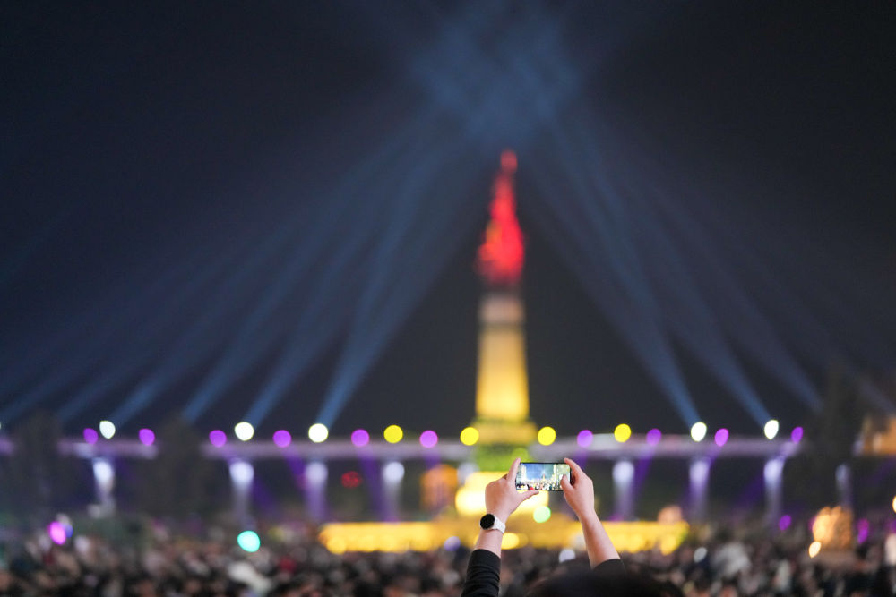 5月3日,人們?cè)诠枮I防洪紀(jì)念塔廣場(chǎng)觀賞、拍攝光影秀。