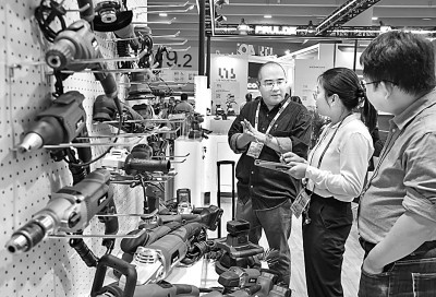 印尼零售企業(yè)在廣交會(huì)五金工具展區(qū)了解中國(guó)企業(yè)的展品。新華社發(fā)