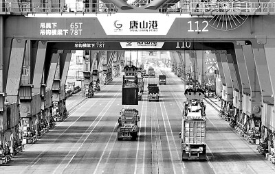 河北唐山港積極打造國(guó)際物流港。圖為工人在京唐港區(qū)集裝箱碼頭操作吊裝設(shè)備。新華社發(fā)