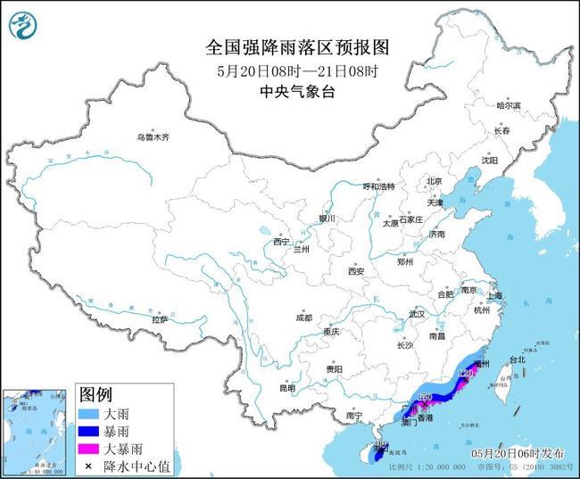 預(yù)計,5月20日08時至21日08時,廣東中東部、福建東部、海南島中東部等地部分地區(qū)有大到暴雨,其中,廣東南部沿海、福建東南部等地部分地區(qū)有大暴雨(100~150毫米)。上述部分地區(qū)伴有短時強降水(最大小時降雨量20~50毫米,局地可超過60毫米),局地有雷暴大風(fēng)等強對流天氣。