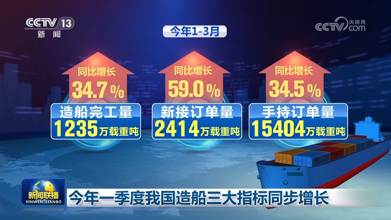 今年1—3月,我國造船完工量1235萬載重噸,同比增長34.7%;新接訂單量2414萬載重噸,同比增長59.0%;手持訂單量15404萬載重噸,同比增長34.5%。以載重噸來計算,三大指標分別占到了全球總量的53.8%、69.6%和56.7%。