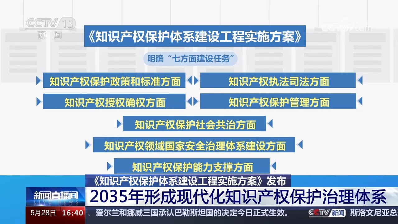國家知識(shí)產(chǎn)權(quán)局5月28日舉行新聞發(fā)布會(huì),重點(diǎn)介紹《知識(shí)產(chǎn)權(quán)保護(hù)體系建設(shè)工程實(shí)施方案》(以下簡稱《方案》)有關(guān)情況?!斗桨浮访鞔_,到2035年,知識(shí)產(chǎn)權(quán)保護(hù)體系和保護(hù)能力現(xiàn)代化基本實(shí)現(xiàn),形成政府履職盡責(zé)、執(zhí)法部門嚴(yán)格監(jiān)管、司法機(jī)關(guān)公正司法、經(jīng)營主體規(guī)范管理、行業(yè)組織自律自治、社會(huì)公眾誠信守法的現(xiàn)代化知識(shí)產(chǎn)權(quán)保護(hù)治理體系。
