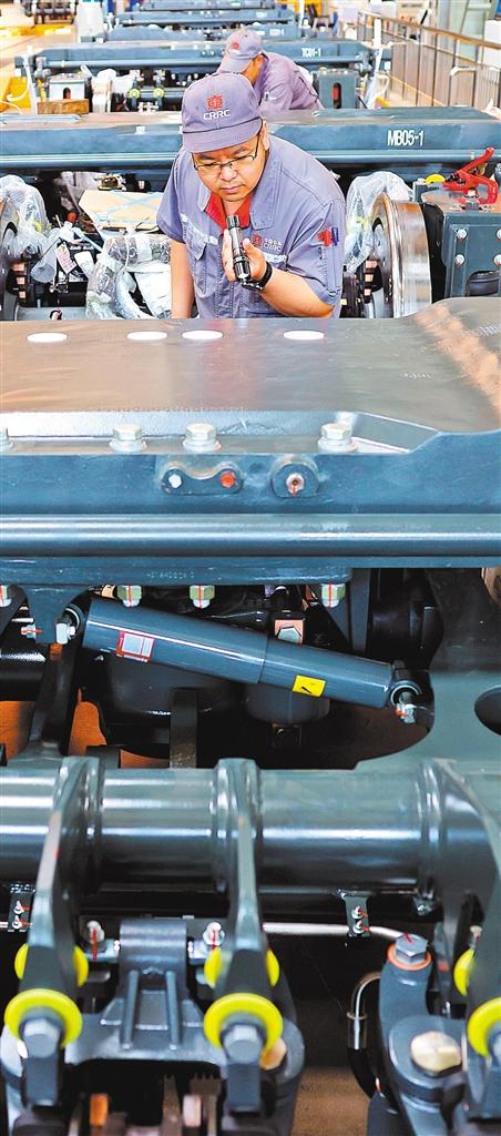 ?5月28日,中車長客轉(zhuǎn)向架事業(yè)部總成產(chǎn)線組,一臺臺轉(zhuǎn)向架排列在數(shù)字化智能產(chǎn)線上。