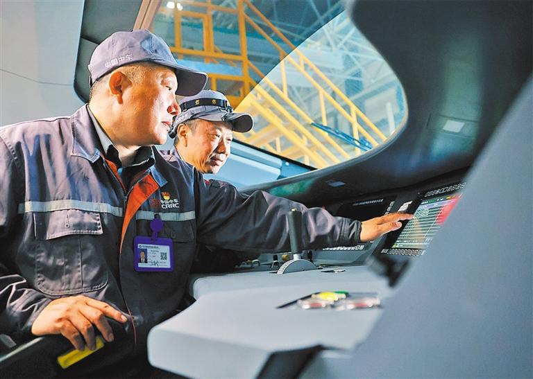 ?5月28日,中車長客首席操作師羅昭強(前一)在對新一批復興號智能動車組進行出廠前的質(zhì)量檢查。