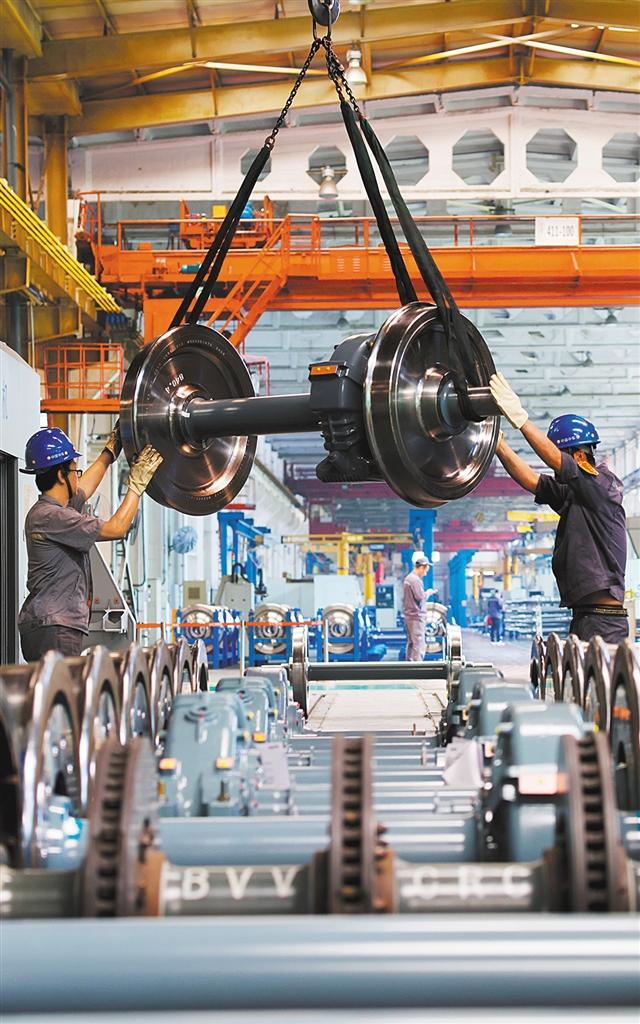 ▼5月28日,中車長客轉(zhuǎn)向架事業(yè)部總成產(chǎn)線組,員工在進行城軌輪對壓裝作業(yè)。