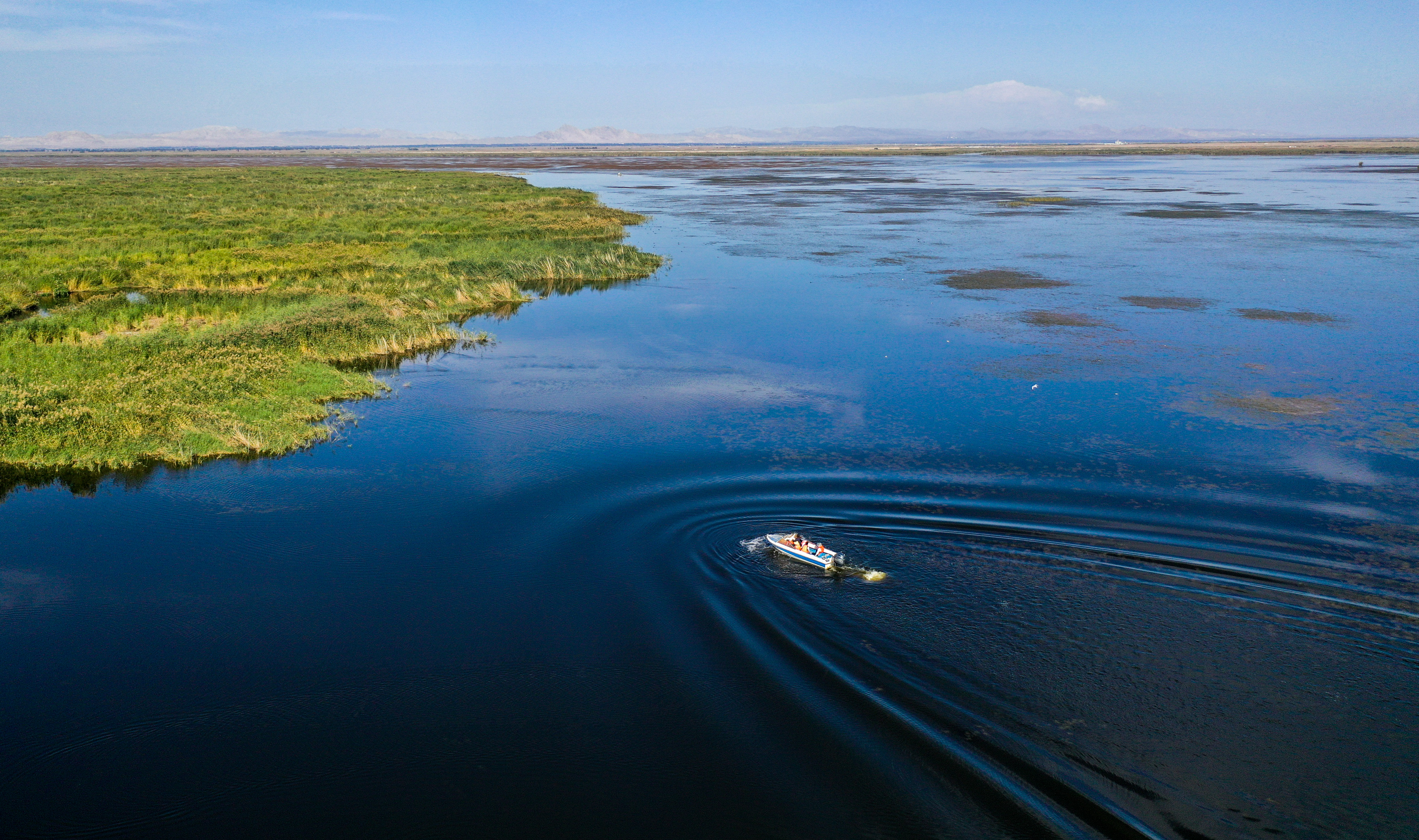 內(nèi)蒙古烏梁素海湖面上,河湖濕地水環(huán)境保護與修復(fù)技術(shù)研究團隊成員乘坐快艇去采集湖水樣本(2023年9月15日攝,無人機照片)。新華社記者 連振 攝