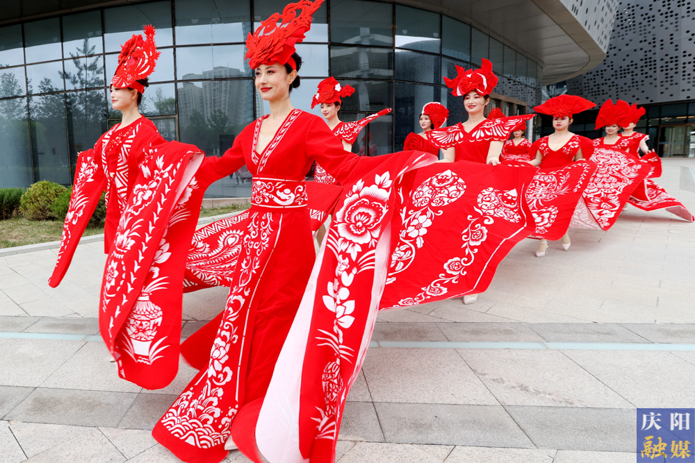 主播們身著刻鏤龍紋、鳳紋、抓髻娃娃、生命樹、魚鉆蓮、牡丹等剪紙紋樣,大V領(lǐng)、魚尾裙、聳肩收腰的“剪云裳”剪紙服裝,行走在傳媒大廈、西峰區(qū)彩虹橋、慶陽市城市海綿運(yùn)動(dòng)綠地等處,全方位、多角度地展示了剪紙服裝的特色與魅力。
