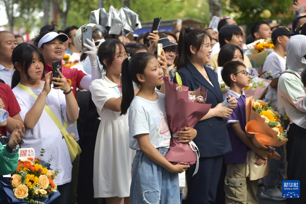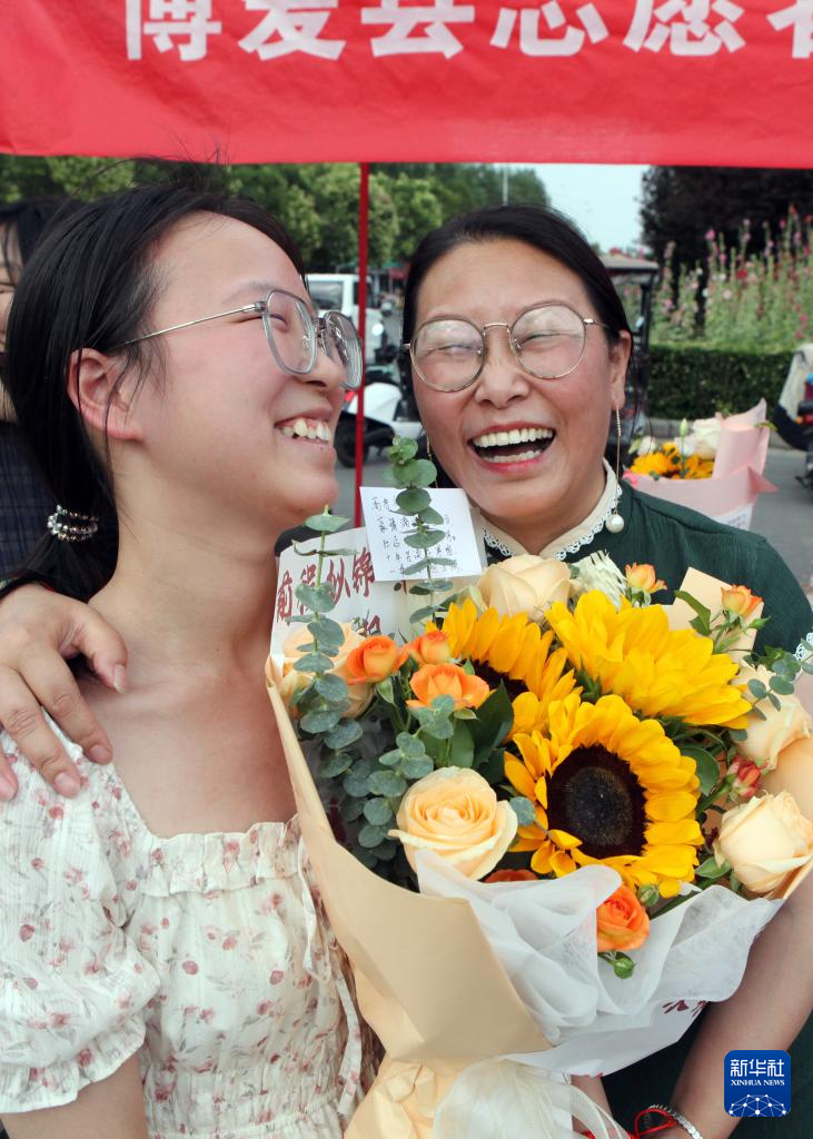 6月8日,在河南省焦作市博愛縣第一中學(xué)考點,家長為走出考場的孩子送上鮮花。新華社發(fā)(程全攝)