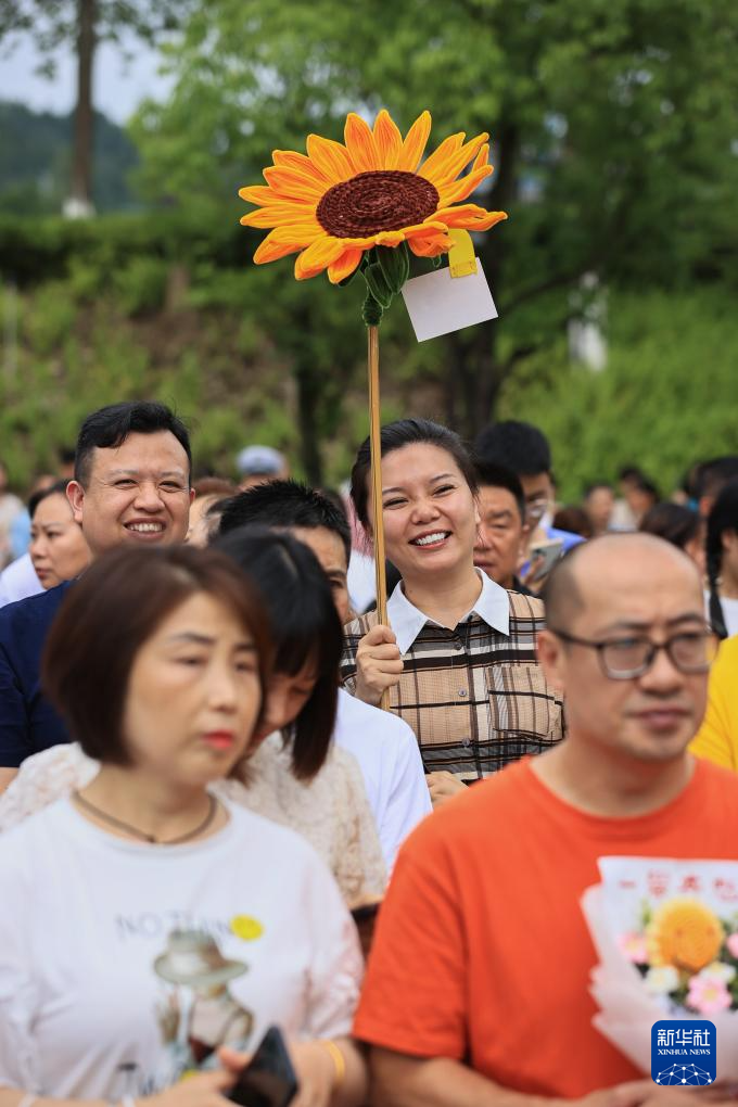 6月8日,在四川遂寧涪江中學(xué)考點,家長手拿寓意“一舉奪魁”的向日葵迎接考生。新華社發(fā)(劉昌松攝)