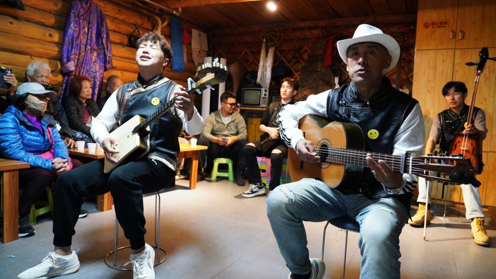 6月2日,在新疆喀納斯景區(qū)家訪點(diǎn),樂(lè)隊(duì)歌手為游客演唱。新華社記者 阿曼 攝