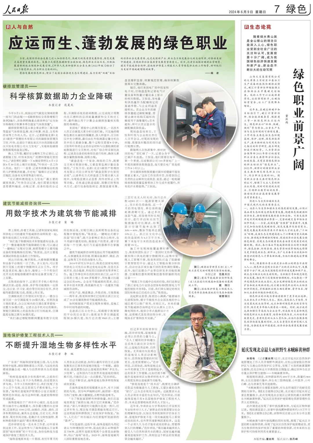 蓬勃發(fā)展的綠色職業(yè),契合了我國(guó)全面推進(jìn)生態(tài)文明建設(shè)、奮力實(shí)現(xiàn)“雙碳”目標(biāo)的經(jīng)濟(jì)社會(huì)發(fā)展需要,也是我國(guó)新產(chǎn)業(yè)、新業(yè)態(tài)不斷發(fā)展壯大的生動(dòng)寫(xiě)照,對(duì)推動(dòng)美麗中國(guó)建設(shè)、實(shí)現(xiàn)經(jīng)濟(jì)社會(huì)高質(zhì)量發(fā)展有重要意義。近日,人民日?qǐng)?bào)記者實(shí)地探訪碳排放管理員、建筑節(jié)能減排咨詢(xún)師、濕地保護(hù)修復(fù)工程技術(shù)人員等綠色職業(yè)的工作場(chǎng)景,傾聽(tīng)他們?yōu)槊利愔袊?guó)減碳增綠的故事。