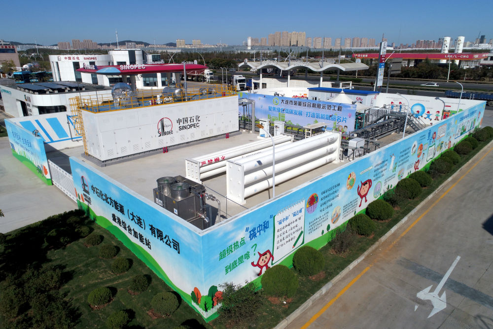 在大連盛港綜合加能站,一輛輛天藍(lán)色的氫能源公交車、白色的氫能源環(huán)衛(wèi)車不時開進(jìn)站內(nèi),不一會兒就能完成加氫操作。這座中石化旗下的甲醇制氫加氫一體站,每天可穩(wěn)定產(chǎn)出1000公斤高純度氫氣,占地面積僅64平方米,場地利用率高,易于推廣復(fù)制。