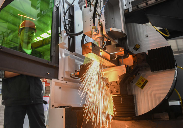 華工科技產(chǎn)業(yè)股份有限公司工作人員在激光設備生產(chǎn)線上工作(資料照片)。(新華社記者 程敏 攝)