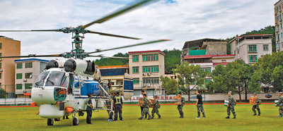 6月17日,廣東省梅州市平遠(yuǎn)縣體育場,直升機(jī)在運送救援物資。