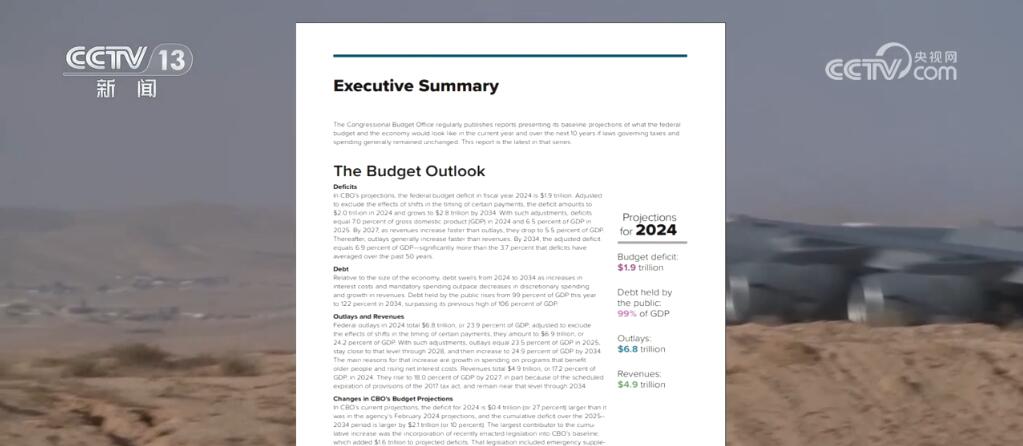 美國(guó)國(guó)會(huì)預(yù)算辦公室18日發(fā)布報(bào)告稱(chēng),在2024財(cái)年,聯(lián)邦政府預(yù)算赤字預(yù)計(jì)將達(dá)到1.9萬(wàn)億美元。