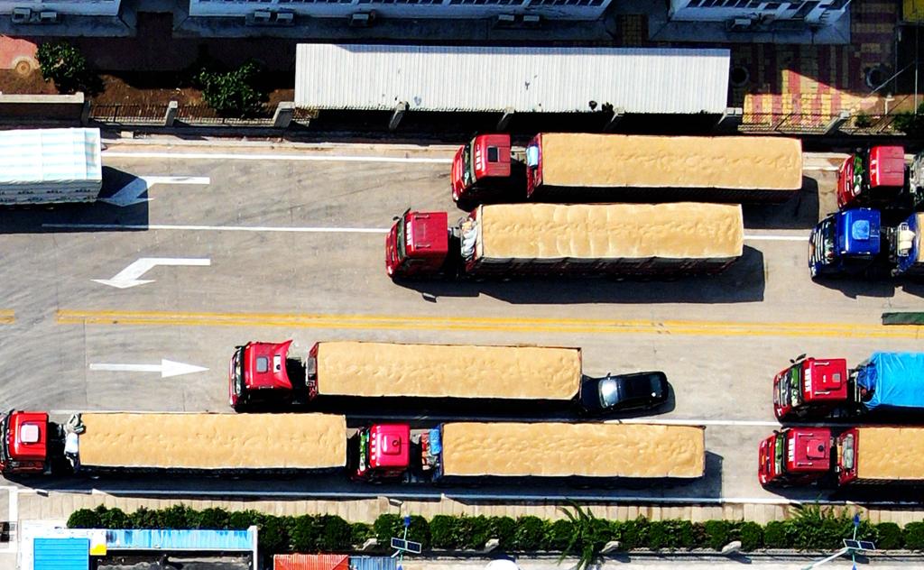 6月15日,在山東省臨沂市平邑縣一處糧食儲(chǔ)備庫(kù)夏糧收購(gòu)現(xiàn)場(chǎng),運(yùn)輸車輛排隊(duì)售糧(無(wú)人機(jī)照片)。新華社發(fā)(武紀(jì)全 攝)