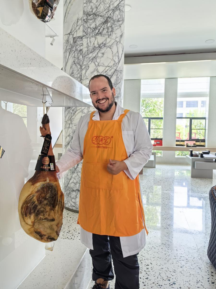 6月2日,新華社古巴籍記者塞爾希奧·戈麥斯在云南省宣威市手持火腿。新華社記者 李曄 攝