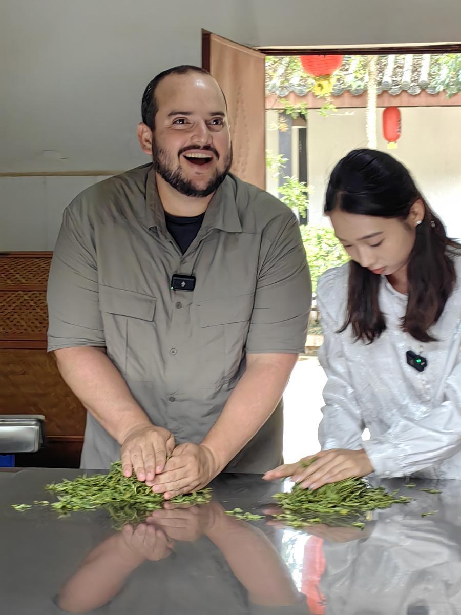 5月29日,新華社古巴籍記者塞爾希奧·戈麥斯(左)在云南省普洱市思茅區(qū)體驗制茶。新華社記者 李曄 攝